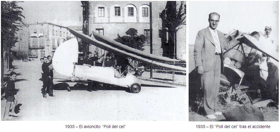 Entrado ya 1936, el balance, si bien poco brillante, tampoco era desmoralizante, al menos para aquellos corajes, cierto es que el “Poll del Cel”, pilotado por Josep Armengol, llegó a cruzar todo el campo de aviación a una altura absolutamente discreta. Cierto es que Jaume Bonjoch estaba radicalmente dispuesto a intentar el vuelo Lleida-Cervera, temeridad de la cual costó mucho disuadirlo. Cierto también que en otra prueba en el campo, esta vez pilotado por Claudi Gómez, el aparato quedó totalmente destruido. Pero estos incidentes no suspendieron el sueño. Lo que lo decapitó fue la Guerra de 1936, cuando la construcción de un segundo “Poll del Cel” estaba muy avanzada.