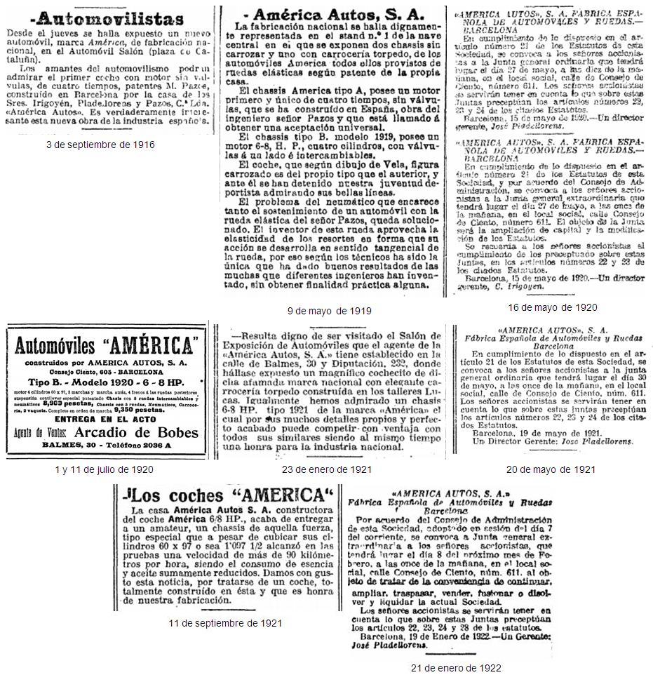 La sociedad “América Autos Sociedad Española de Automóviles y Ruedas, S.A.” fue la continuadora de otra, establecida por tres socios en 1913 con el nombre inicial de “Irigoyen, Pladellorens y Pazos”. La intención de fabricar automóviles, fue posiblemente la causa del cambio de denominación social.