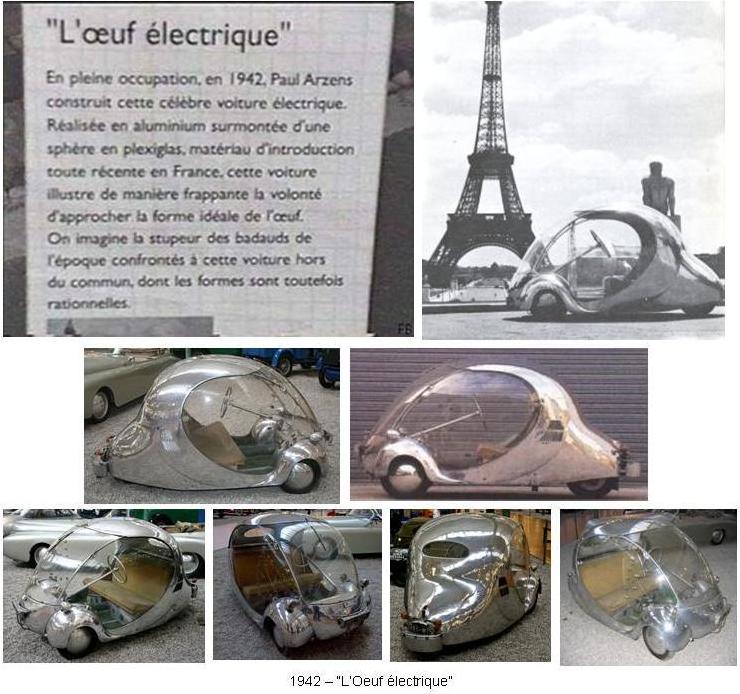 En 1942, diseñó y construyó el "Oeuf éléctrique", concebido para sus desplazamientos cotidianos. Este coche de dos plazas y tres ruedas era eléctrico. Estaba realizado en aluminio y recubierto de una esfera de plexiglás. El motor, un monocilíndrico de 125 cc y 5,5 hp. Permitía al coche alcanzar velocidades de 80 Km/h. El diseño de este coche ilustra de manera indiscutible la voluntad de Arzens de acercarse a las formas de un huevo.