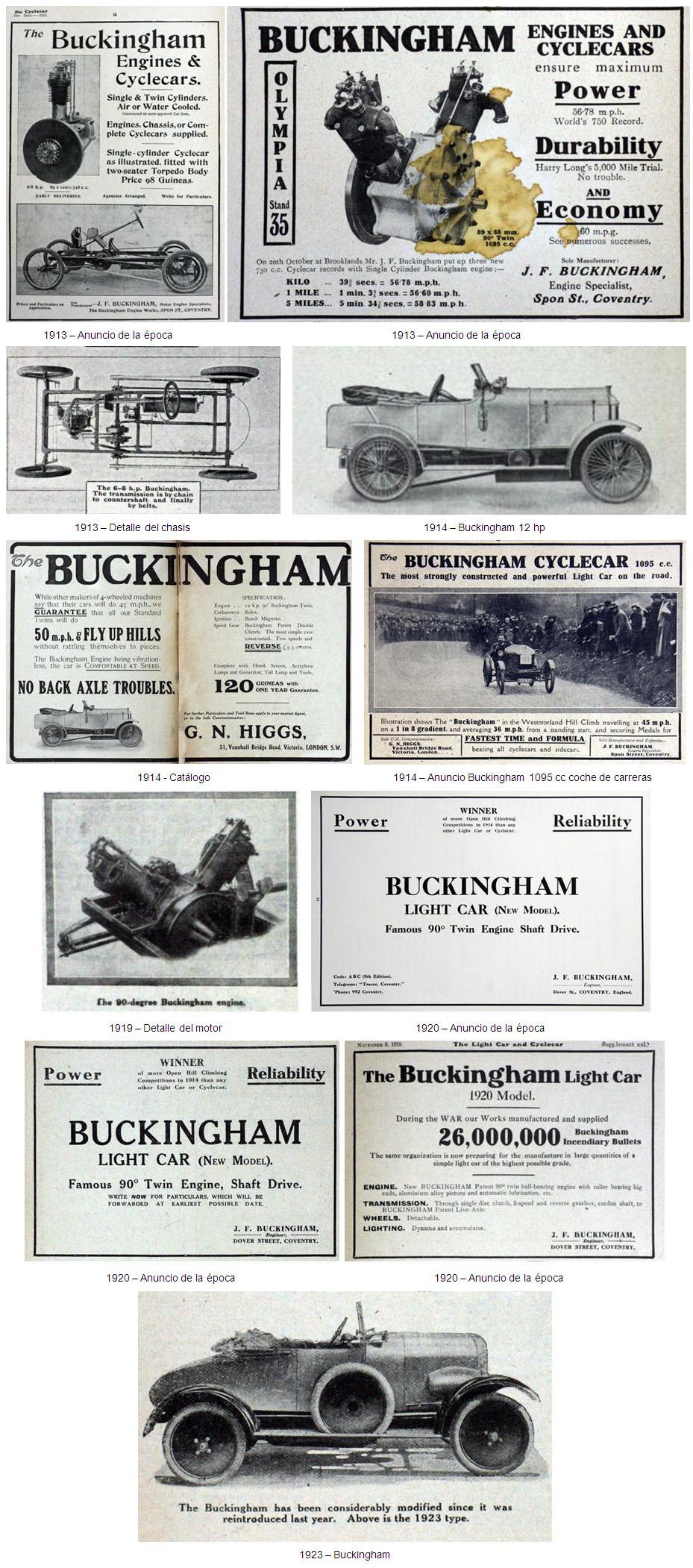 El “Chota” (ver historia) era un extraordinario cyclecar con un bajo centro de gravedad y con un largo capó de madera en forma de cono. Se afirmó que el “Chota” había sido creado para superar records en Brooklands, pero la verdad es que también se ofrecía a la venta. En 1913 J.F. Buckingham incorporó un nuevo motor de dos cilindros en V (ligeramente escalonados) de 1492cc refrigerado por agua, y en septiembre rebautizó la compañía con el nombre de “Buckingham Engineering Company Limited”, la trasladó al número 15 de Dover Street, Coventry, y los coches “Chota” empezaron a llamarse “Buckingham“.