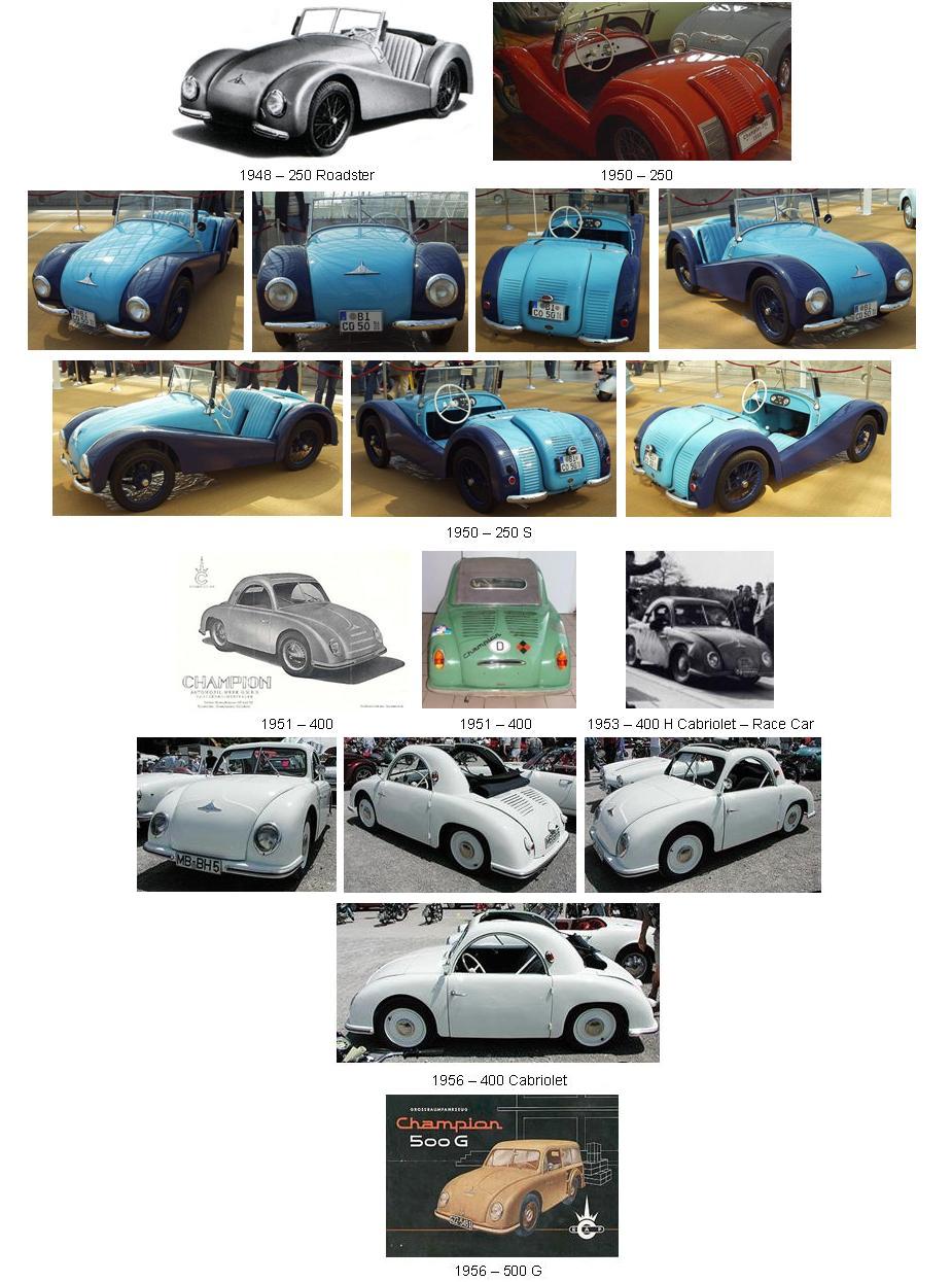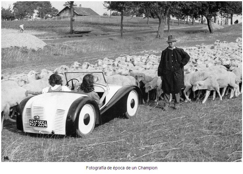 Aparece en 1948 el Champion Ch1, un pequeño cabriolet equipado con un motor de motocicleta de 200 cc y 5 cv de potencia. Como es de suponer, las prestaciones eran insuficientes, cifrándose la velocidad máxima en 50 km/h...aunque para la utilidad que se le quería dar a este automóvil no importaba, ya que solo importaba que fuera capaz de trasladar de un lugar a otro a sus ocupantes.