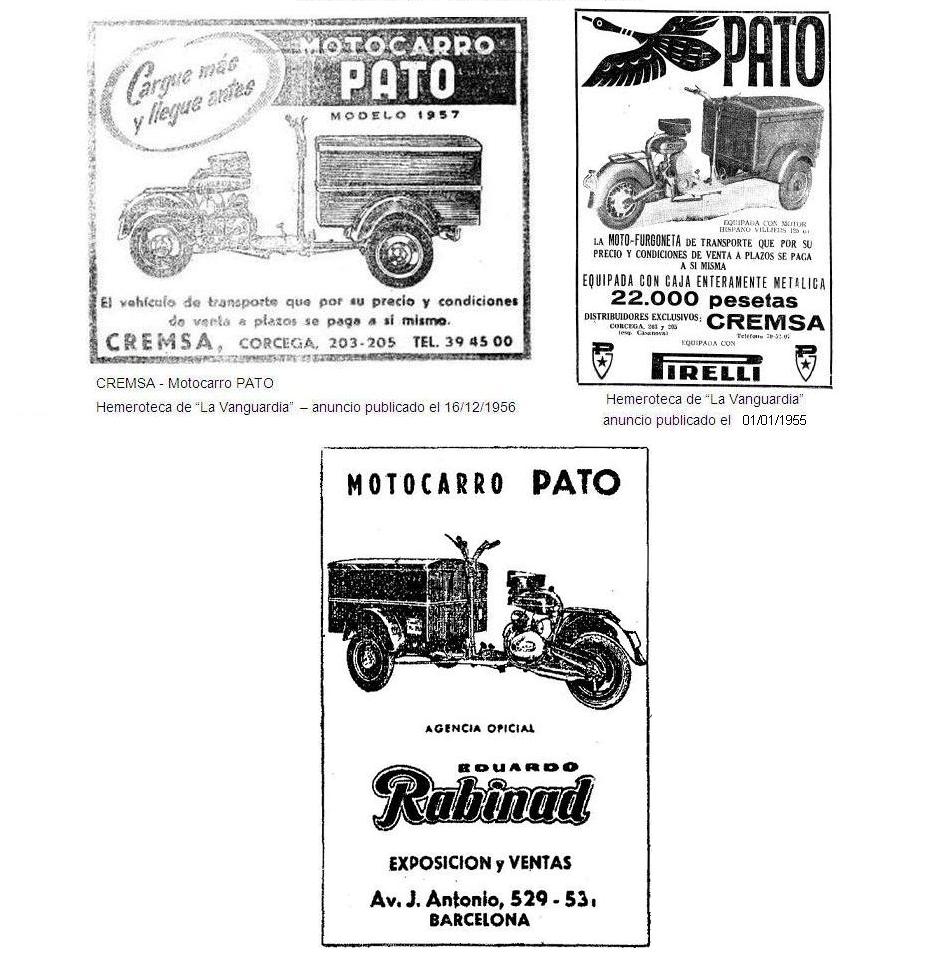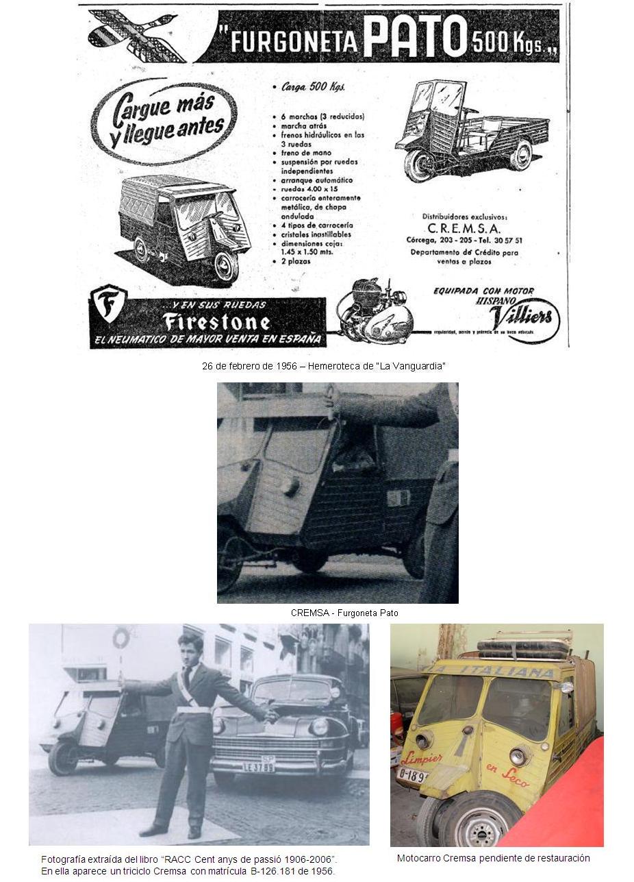Paralelamente a sus principales actividades, en 1956 inició la fabricación de motocarros en sus instalaciones de la calle Cristóbal Moura, 14-20 de Barcelona, aunque la comercialización también se realizaba en la calle Córcega 203-205. El motocarro CREMSA disponía de una caja de carga delantera y manillar independiente con columna de dirección. Estos motocarros fueron denominados "Pato" (con el transcurrir del tiempo veremos que la firma tenía mucho apego al mencionado animal).