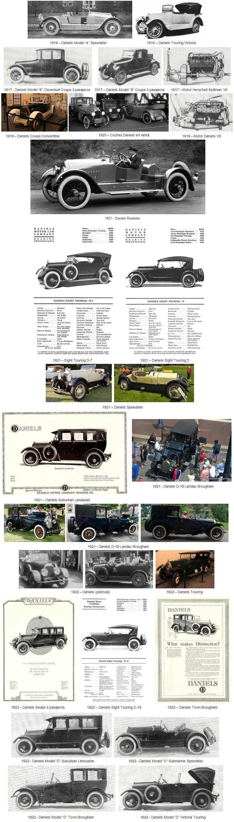 En 1921 el modelo “D” de Daniels, también se ofreció con siete estilos diferentes de carrocería; Touring de 4 pasajeros (5.689 dólares), Speedster de 2 pasajeros (5.350 dólares), Roadster de 3 pasajeros (5.350 dólares), Touring de 6 pasajeros (5.350 dólares), Coupe de 3 pasajeros (6.250 dólares), Roadster y Winter plegable (6.500 dólares) y Sedán de 4 pasajeros (6.950 dólares).