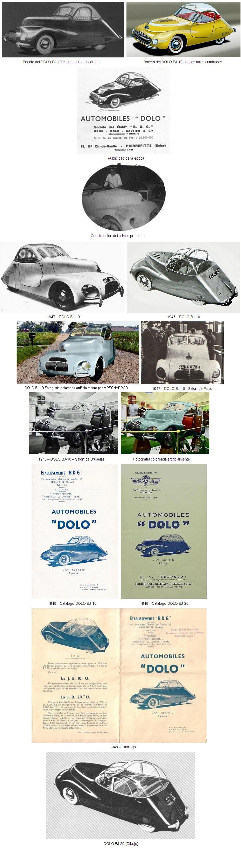 Unos completos desconocidos en los círculos de la industria del motor, los señores Brun, Dolo y Galtier, a través de una empresa que llevaba sus iniciales, la “Société BDG” de Pierrefitte, Francia, presentaron en el Salón de París de abril de 1947 (que era principalmente una feria de arte) el prototipo de un coche denominado DOLO BJ-10, aparentemente muy moderno y económico comparado con los anticuados modelos ofrecidos por otros fabricantes de automóviles más conocidos.