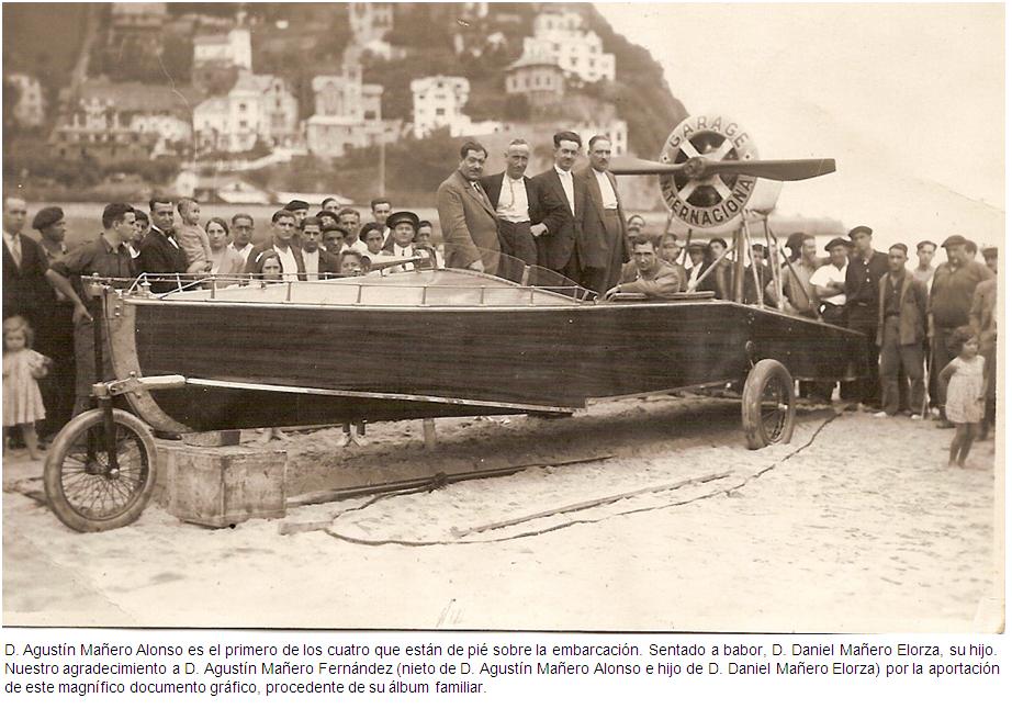 “Seguramente yo la conocería, pero no llego a recordar aquella canoa que se construyó (también en el Garaje Internacional), con un motor de avión con doce cilindros rotativos, fruto del largo contacto de Agustín Mañero Alonso con los aviones. Me contaron que cuando semejante motor se ponía en marcha, por sus vibraciones y potencia, se solían romper los cristales de los hoteles Londres y Continental. Supongo que esto ocurriría alguna vez y no habitualmente, aunque a mi padre (Daniel Mañero Elorza) le he oído narrar ese episodio en varias ocasiones.”