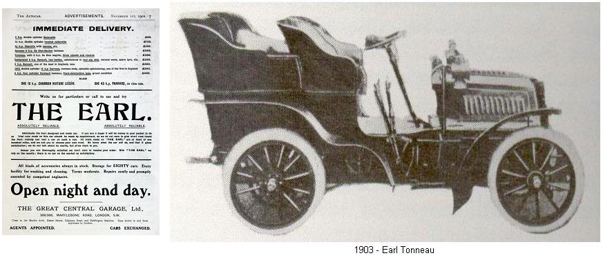 En 1903, el “Great Central Garage” de Londres, comercializó con el nombre de Earl un coche de 11 hp. para 4 pasajeros, del que se vendieron pocas unidades. Posiblemente se tratara de algún modelo importado de Francia a pequeña escala.