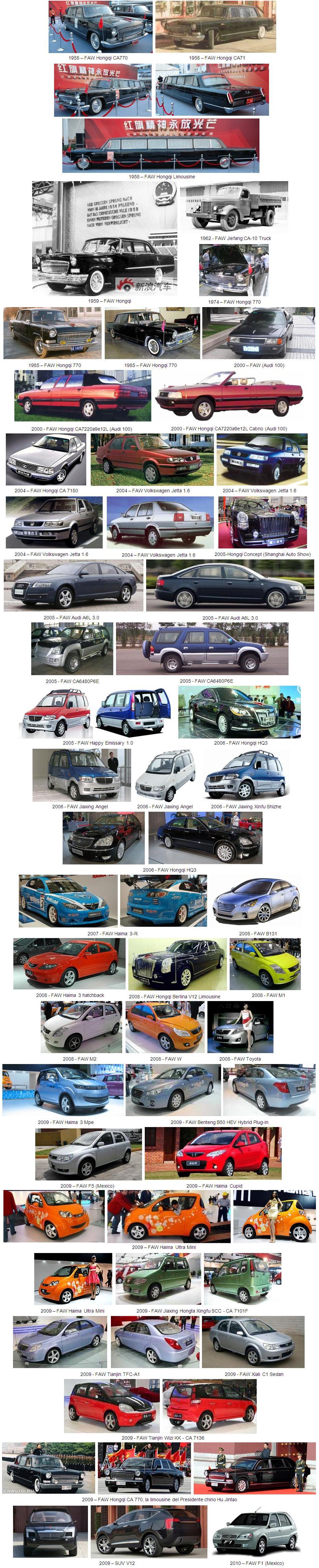 El logotipo de FAW representa la combinación de los caracteres chinos "一" (primero) y "汽" (automóvil), representando a un halcón que extiende sus alas. La producción de automóviles empezó en 1958, con la marca “Hongqi”, y actualmente también produce las marcas “Jiaxing”, “Xiali” y “Haima” (acrónimo de Hainan y Mazda).