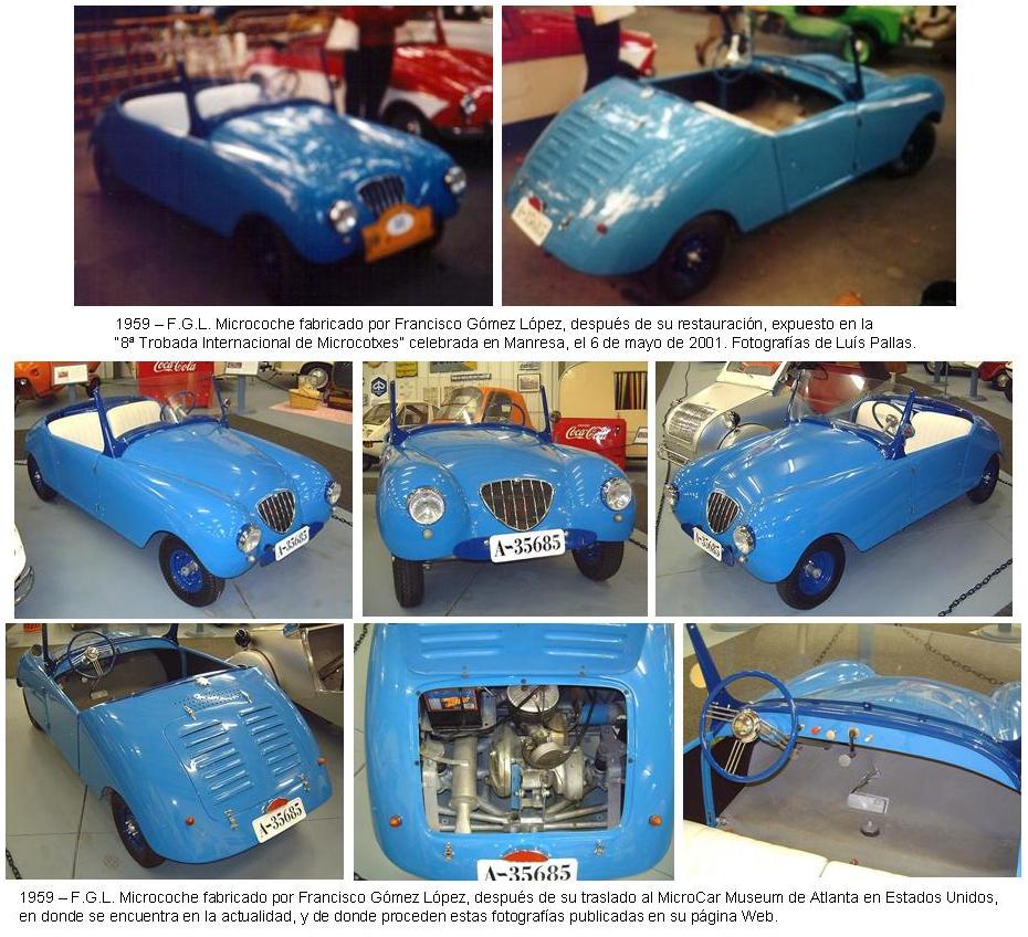 Este es el típico ejemplo de un vehículo identificado con las iniciales de su creador. Este pequeño y encantador coche de dos plazas fue realizado por Francisco Gómez López, con domicilio en el número 2 de la calle Calvo Sotelo de Almoradí, provincia de Alicante, en España. Francisco Gómez tenía estudios de maestría industrial, era diplomado en mecánica e ingeniería eléctrica, y era propietario de un taller de cerrajería.