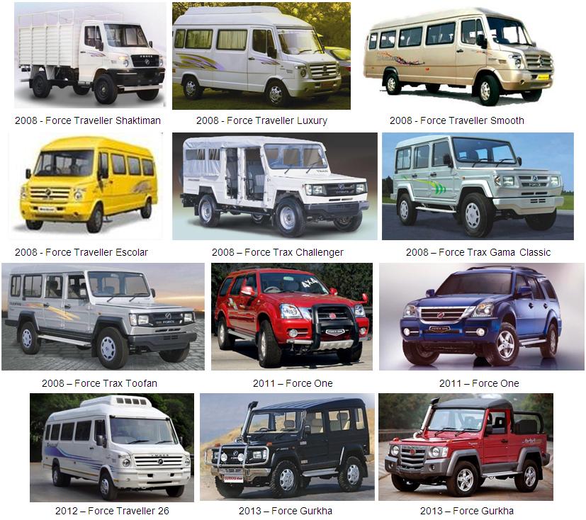 En 2011, Force Motors lanzó el Force One, su primer vehículo destinado al segmento de los vehículos de uso personal, en 2012 presentó un revolucionario vehículo de pasajeros denominado Force Traveller 26, y en 2013 fue presentado el Force Gurkha.