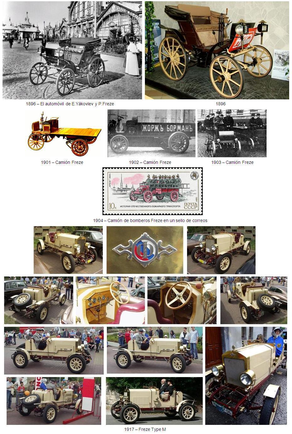 El primer coche fabricado en Rusia impulsado por un motor de gasolina fue construido en 1896 por los diseñadores Eugene A. Yakovlev y Peter A. Freze (ver historia Jakovlev & Freze).