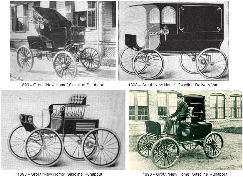 Los hermanos Carl, Fred y C.B. Grout, hijos de William H. Grout, fabricaron su primer automóvil en 1896. Era un vehículo con capacidad para dos personas, alimentado por un motor de gasolina de dos cilindros (opuestos) y dos tiempos, refrigerado por agua. El pesado motor tenía potencia suficiente pero la transmisión apenas podía con su peso. Los hermanos Grout fabricaron alrededor de una docena de estos vehículos durante los años 1897, 1898, y 1899. Esos primeros coches fueron vendidos con el nombre “New Home”.