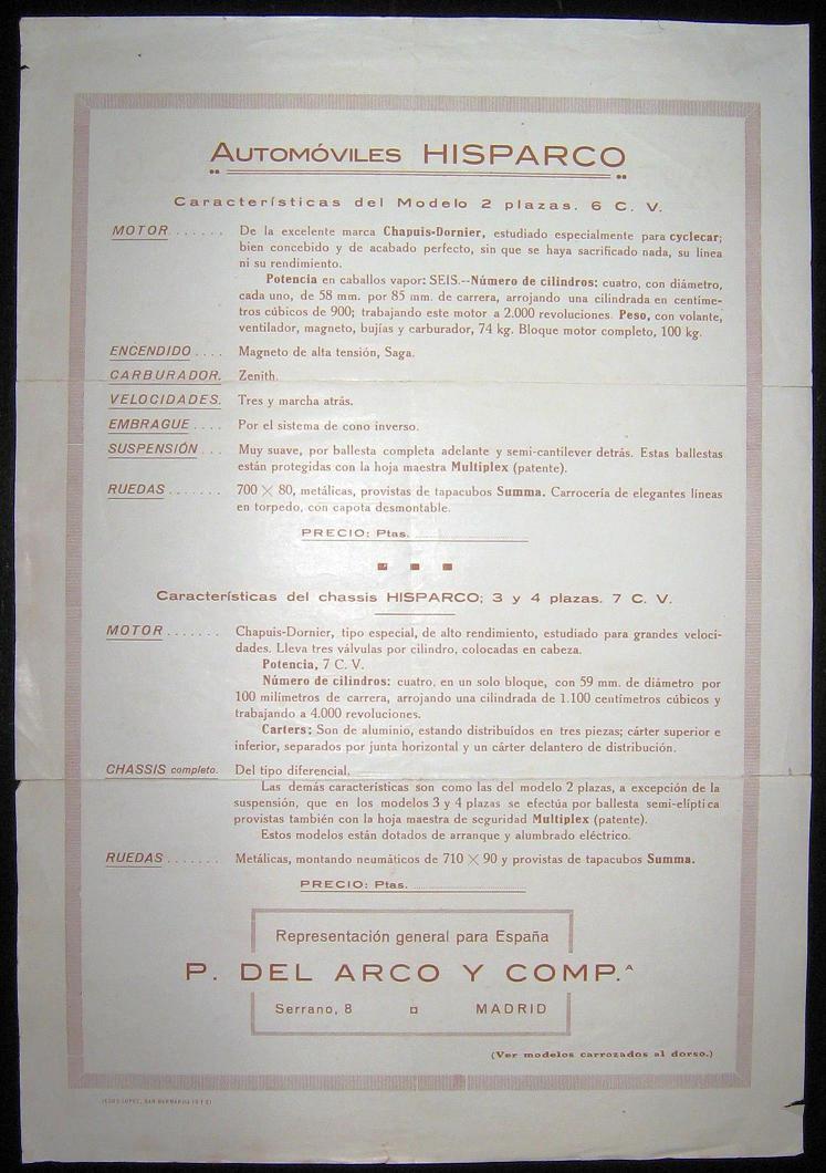 Hisparco nace en Madrid en 1924 de manos del ingeniero Carlos Pérez del Arco (P. del Arco y Compañía). Los cyclecars Hisparco tenían la peculiaridad de llevar pintada la bandera española en el radiador.