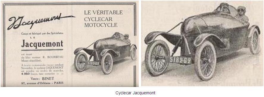 Instaló su taller en el distrito XIV de París dónde fabricó sin mucho éxito el cyclecar Jacquemont. El cyclecar Jacquemont estaba constituido por un bastidor/carrocería de una sola pieza en chapa fina de acero y en forma de obús. Estaba equipado con un motor monocilindrico de 1097 cc, con aletas de refrigeración en forma de espiral alrededor del cilindro, y transmisión por correa doble. El cambio de marchas era igual que el del cyclecar Bédélia. El cyclecar Jacquemont se vendía al precio de 4.950 francos.