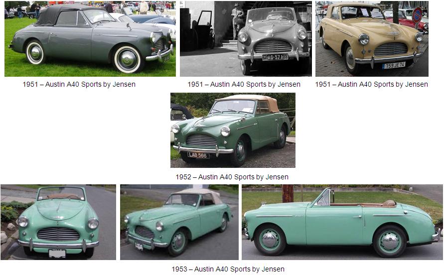 Austin A40 Sports: Como resultado de una serie de colaboraciones entre Austin y Jensen apareció el Austin A40 Sports. Cuando el Presidente de Austin Leonard Lord vió el Interceptor, encargó a Jensen el desarrollo de una carrocería que pudiera utilizar los elementos mecánicos del Austin A40. El resultado fue el Austin A40 Sports, que fue presentado en Londres en el “London Motor Show” de 1949. El modelo había sido diseñado por Eric Neale, que había trabajado en Wolseley y que se había unido a Jensen en 1946. Durante su producción, las carrocerías de aluminio del Austin A40 Sports eran construidas por Jensen y posteriormente transportadas a la planta de Austin en Longbridge para su ensamblado final. Se llegaron a producir más de 4.000 unidades entre 1951 y 1953.