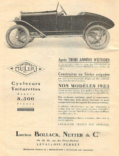 Los cyclecars “Jacques Muller”, también denominados “JMK” hicieron su aparición en el mercado a principios de 1920. Según documentos de la época, parece ser que de hecho la producción no empezó hasta 1922 y que los 2 primeros años sirvieron sobre todo para desarrollar y poner a punto el vehículo.