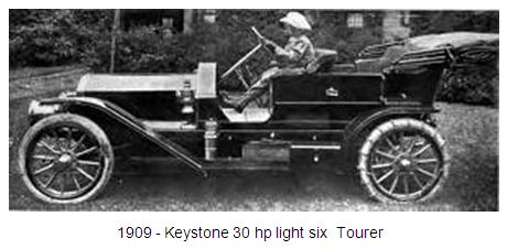 Está documentado que en 1909, el Keystone 30 hp Light Six Tourer Model 10, tenía una distancia entre ejes de 2.946 mm y capacidad para 5 pasajeros. Estaba equipado con un motor atmosférico de 4 litros (3983cc) y 6 cilindros (2 válvulas por cilindro). La caja de cambios era manual de 3 velocidades y su peso en vacío era de 878 kg.
