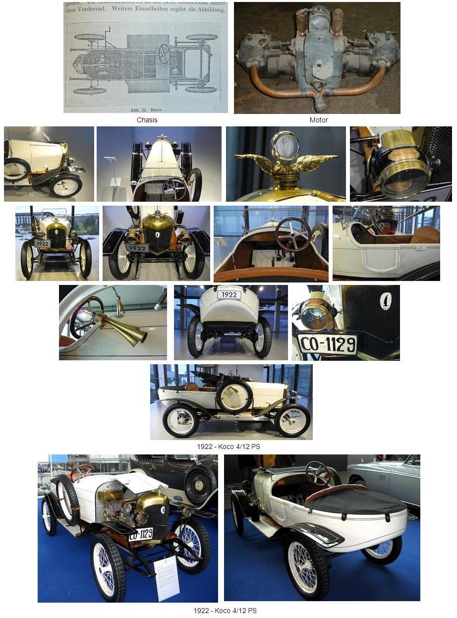 El primer coche Koco era un Cyclecar, con transmisión por cadena, que estaba equipado con un motor bóxer de 2 cilindros y 1020 cc. Los primeros motores estaban refrigerados por aire, pero tras un breve periodo la compañía cambió el sistema empezó a construir motores refrigerados por agua.
