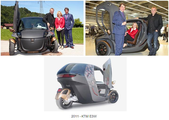 En 2011, el fabricante austriaco KTM desarrolló el prototipo de un triciclo eléctrico de bajo coste destinado a facilitar la movilidad urbana. Su nombre es KTM E3W, y es un triciclo eléctrico con una carrocería autoportante realizada con elementos plásticos y algo de CFRP (Carbon-Fiber-Reinforced Plastic).