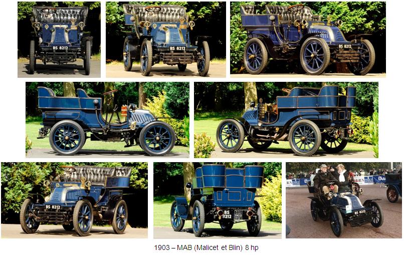 El primero es un modelo MAB Tonneau fabricado en 1897 equipado con un motor horizontal monocilíndrico de 4 hp y 1424cc, refrigerado por agua, con tracción por cadena y con capacidad para 4 pasajeros dispuestos “vis à vis”.