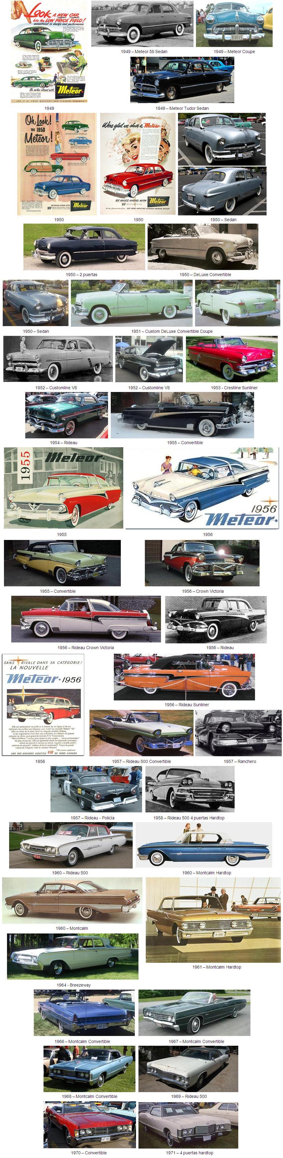 El primer coche Meteor, el modelo para 1949, fue presentado el 25 de junio de 1948. Estaba equipado con una carrocería Ford con parrilla delantera de Mercury y estaba propulsado por un motor V8 de 100 hp. Meteor, al igual que los Ford canadienses, mantuvo su motor “flathead” V8 hasta 1954, y para el modelo de 1955 introdujo un nuevo motor OHV V8. Al año siguiente la Ford canadiense introdujo un motor de 6 cilindros que fue utilizado por los Ford de Canadá y por los Meteor. Meteor siguió utilizando carrocerías Ford con artículos distintivos únicos como parrillas, taillights y moldeados hasta 1961.