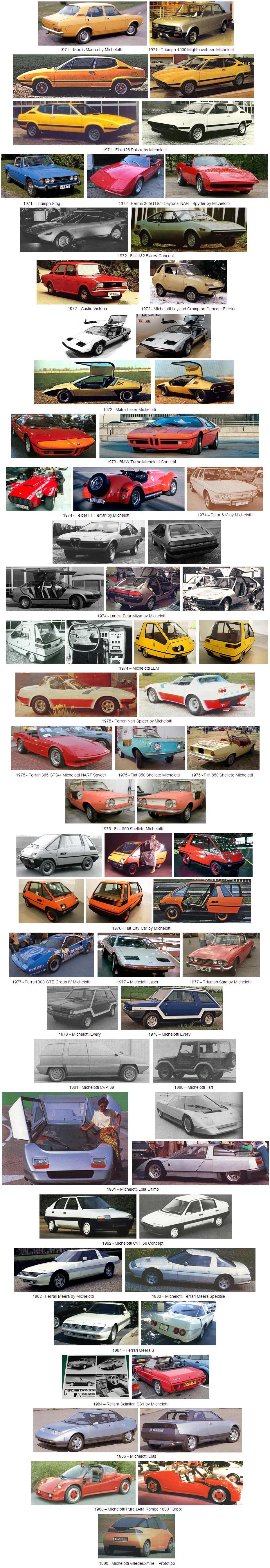 En el Salón de Ginebra de 1974, Michelotti propuso el Lancia Beta Mizar con 4 puertas en forma de ala de gaviota y el automóvil urbano eléctrico LEM, los cuales volvió a presentar en Turín, junto con un Ferrari Nart Spider.