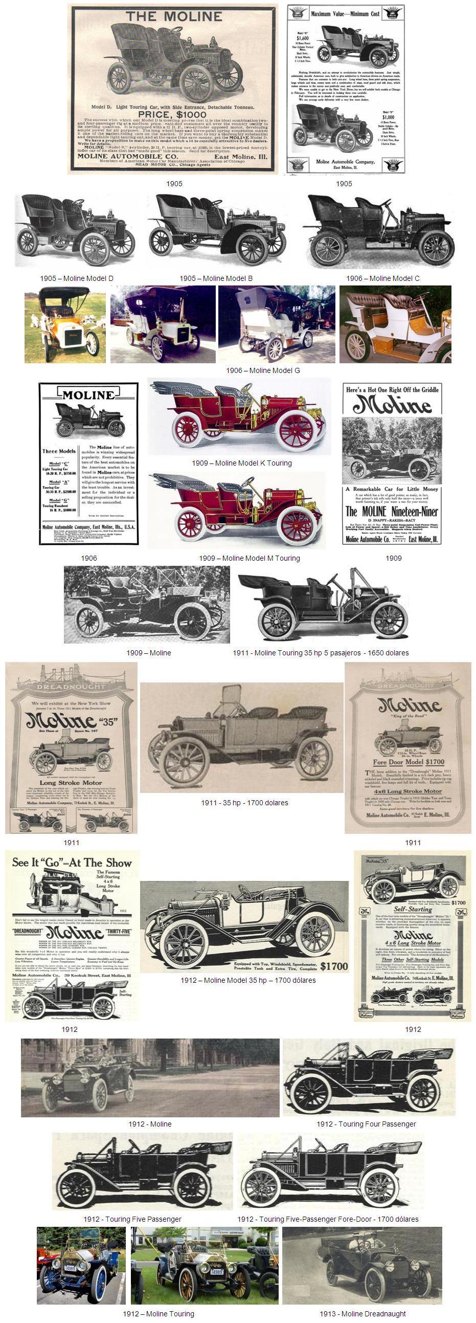 Entre 1906 y 1909 los coches Moline fueron bastante populares. Durante esos años Moline produjo el modelo C, equipado con un motor de 4 cilindros de 18/20 hp, y una distancia entre ejes de 100 pulgadas. La transmisión era de tres velocidades y se comercializaba al precio de 1.750 dólares.