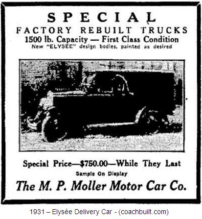 Se dice que el único vehículo realmente “made in” “Möller Co.”, fue el Elysée panel delivery. El Elysee, utilizaba la misma parrilla de radiador y el mismo motor Continental Red Seal de 6 cilindros que el coche Standish, y se ofrecía en diferentes versiones de carrocería tipo “Band Box”; el “Fifth Avenue”, el “Courier” y el “Mercury”, con diferentes capacidades de carga. Se trataba de coches de reparto elegantes, que eran utilizados para el reparto y entrega de paquetes delicados a las casas ricas y elegantes.