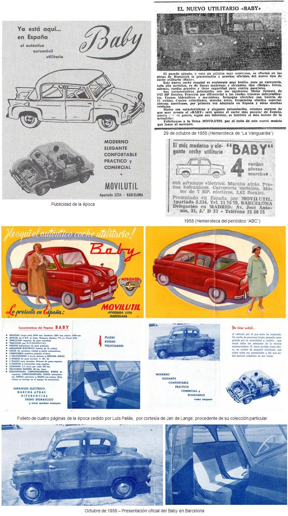 En octubre de 1958, MOVILUTIL presentó el BABY en Barcelona, en las pistas del circuito de Montjuich. Se trataba de un modelo utilitario con carrocería de dos puertas de chapa metálica, pintada al duco, con capacidad teórica para cuatro personas (2+2), y butacas de goma espuma.