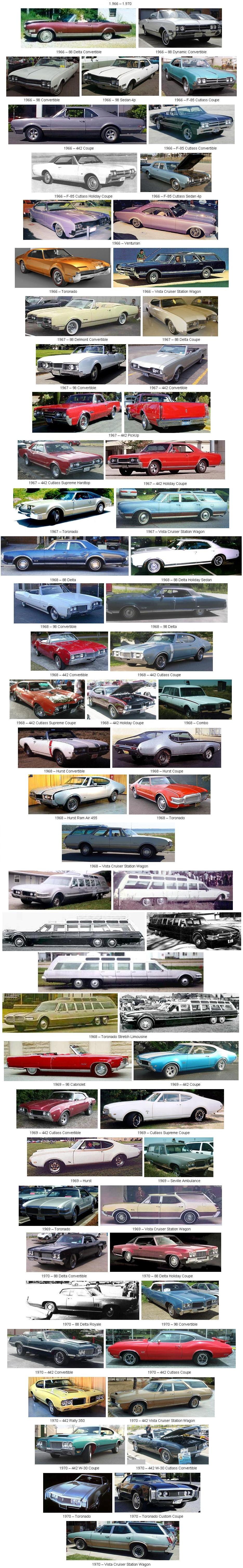 De los primeros 1.005 coches de 1908 se pasó a 36.072 en 1933 y a 310.795 en 1958. En esa época, los motores Rocket del modelo SS alcanzaron una potencia de 300 caballos. El Cutlass y el Delta eran los coches más populares de Oldsmobile. Pero el más importante llegó a mediados de los 60. Fue el Toronado.