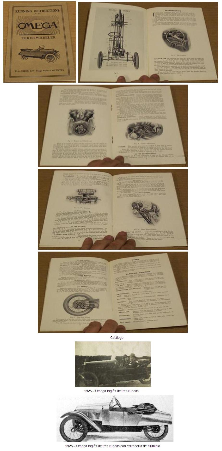 En 1925, fue introducido el primer Omega de tres ruedas. Este vehículo, estaba equipado con un motor JAP refrigerado por agua de 980 cc, que ejercía la tracción mediante cadena a la única rueda trasera, que tenía piñones a ambos lados. El Omega de tres ruedas también estaba equipado con unas excelentes luces eléctricas. Alcanzaba una velocidad máxima de cerca de 60 mph, y a pesar de su elevada velocidad comparado con otros vehículos de su época, los frenos en las ruedas delanteras eran opcionales.