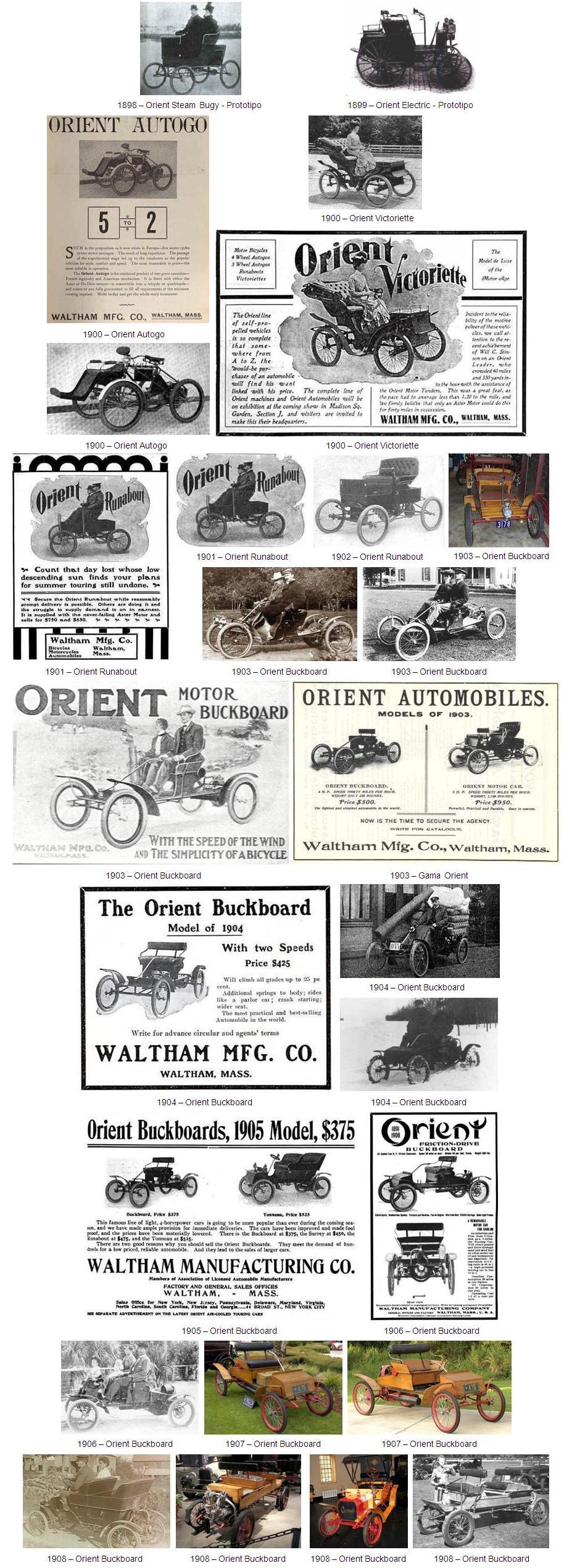 Tras haber fabricado coches de vapor para terceros (Ver historias "American Waltham" y "Waltham Steam Car") y haber incluso fabricado sus propios prototipos de vapor en 1898 (Orient Steam Buggy) y eléctrico en 1899 (Orient Electric), en el año 1900 la “Waltham Manufacturing Company” inició la producción de sus propios automóviles de gasolina.