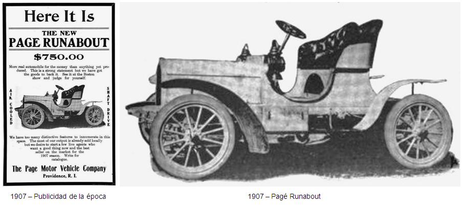 El “Pagé” era un coche pequeño con capacidad para dos pasajeros tipo Runabout, un estilo muy popular en aquella época. El primer Pagé Runabout estaba equipado con un motor de 2 cilindros y 10 hp, refrigerado por aire. La transmisión, ejercida sobre el eje trasero, era de dos velocidades.