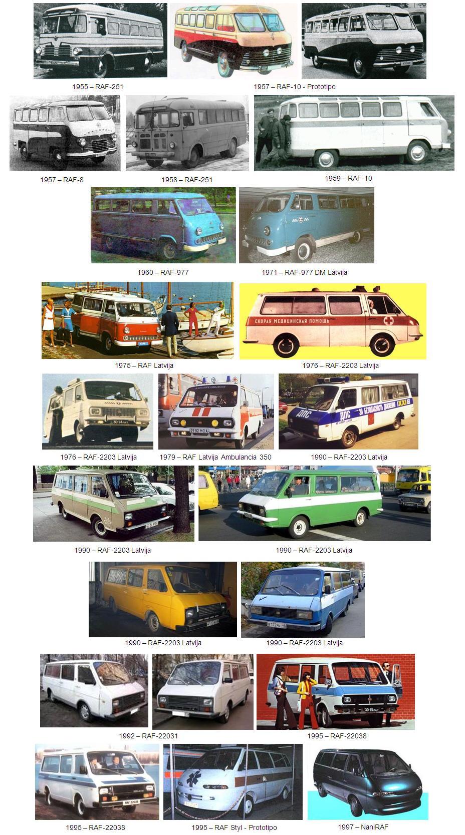 | RAF-977 Latvija - GAZ-21 based 10-passenger van/bus/ambulance/taxi (1959-1976). Also made in D, DM and IM models. |