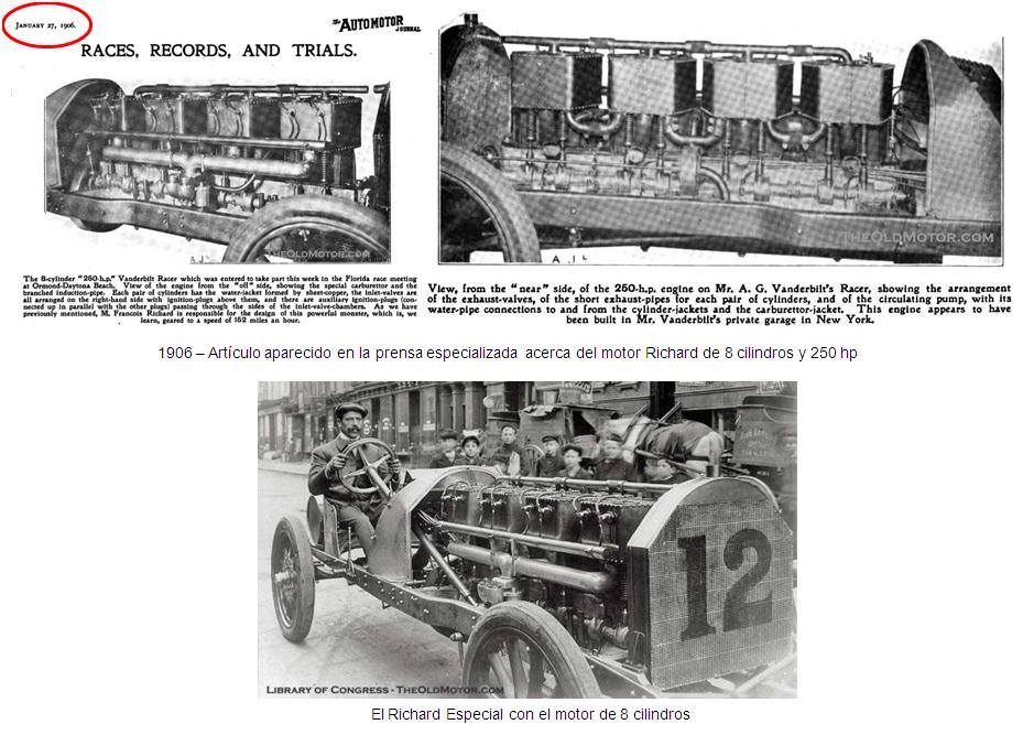 Los automóviles “Richard” utilizaron varios motores diferentes. Francois Richard diseñó y construyó primero un motor de un solo cilindro. Con ese motor, los coches “Richard” eran capaces de alcanzar los 128 Km/h (80 mph). Más tarde construyó un motor de cuatro cilindros. Ese motor desarrollaba 96 hp y alcanzaba una velocidad máxima de 132 Km/h (82 mph).