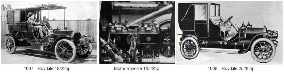 El primer modelo “Roydale” fue presentado en 1907. Estaba equipado con un motor monobloque de 4 cilindros, de 18/22hp., carburador Binks y una caja de cambios situada sobre un sub-chasis.