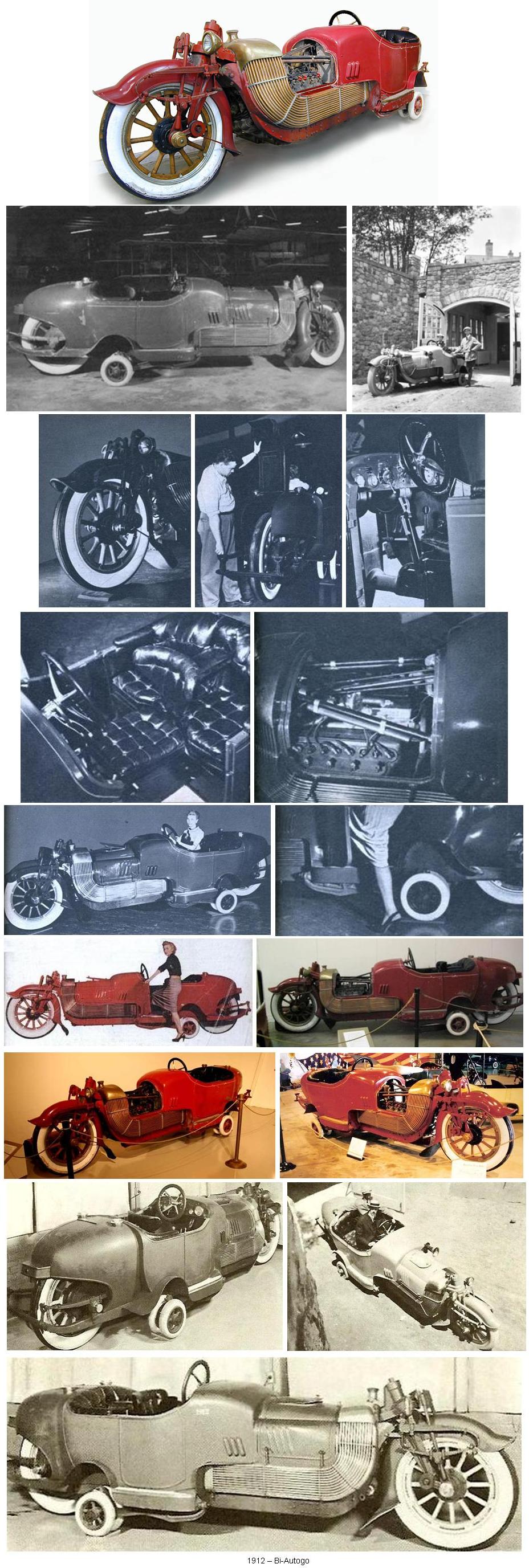 Se trataba de un monstruoso vehículo a medio camino entre un coche y una motocicleta, al que llamó “Bi-Autogo”. Este peculiar vehículo de seis ruedas (con radios de madera) y neumáticos blancos fue construido entre 1908 y 1912. La disposición de las dos ruedas principales era similar a una motocicleta, una delante y otra detrás, pero disponía de dos juegos laterales de dos ruedas cada uno (más pequeñas) situadas en la parte posterior del vehículo. Parado y a baja velocidad, el conductor podía bajar las ruedas pequeñas para estabilizar el vehículo pero a altas velocidades el conductor podría cambiar a dos ruedas y circular igual que en una motocicleta. Este ingenio, con starter/arrancador de aire comprimido, estaba propulsado por el primer motor de 8 cilindros nunca construido, obra del propio James Booth, y desarrollaba 45 hp.
