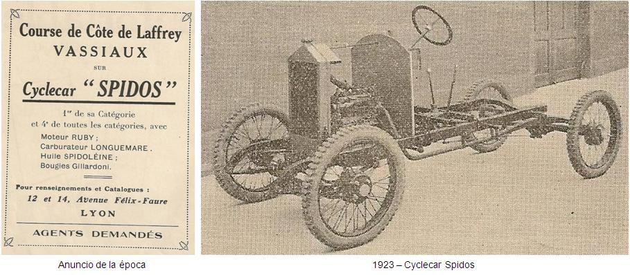 Los cyclecars “Spidos” fueron fabricados entre 1921 y 1925 por el piloto y periodista Aimé Vassiaux, en unos talleres situados en los números 12 y 14 de la Avenue Félix-Faure de Lyon.