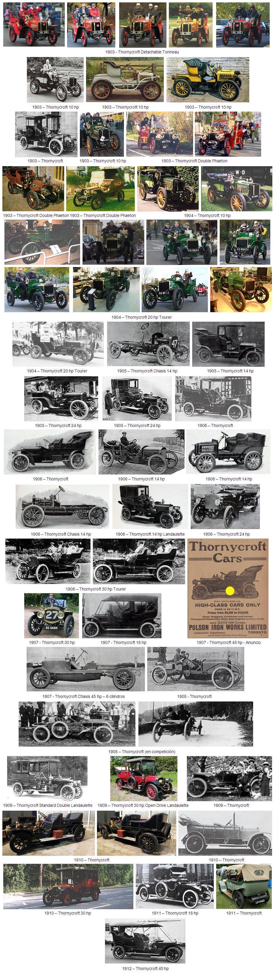 En 1909 la gama Thornycroft comprendía tres modelos: Un 18 hp, un 30 hp de 4 cilindros, y un 45 hp de 6 cilindros, todos ellos con bastidores monobloque y válvulas elevadas. Eran coches de calidad y bien diseñados, pero la creciente demanda de producción de vehículos de transporte público, y un notable aumento de las ventas de esos vehículos, tanto en el mercado local como en el de la exportación, forzó a la dirección de la empresa a concentrarse es esa línea y a cesar la producción de automóviles en 1913.