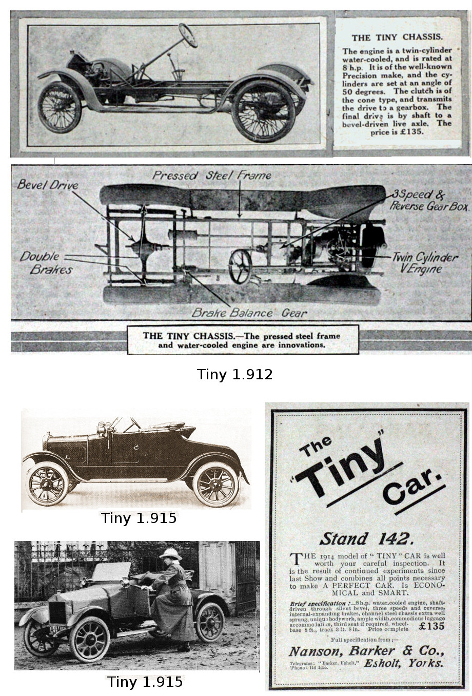 El primer modelo fue producido en 1912 y exhibido ese mismo año en el “London Motor Cycle Show” celebrado en el Olympia de Londres. Estaba impulsado por un motor bicilíndrico JAP de 8 hp., refrigerado por aire. La transmisión, mediante cadena, tenía tres velocidades. A diferencia de la mayor parte de los cyclecars de la época, el Tiny estaba equipado con un diferencial en el eje trasero. El chasis era tubular y la carrocería de dos plazas tipo torpedo era de aluminio y tenía una distancia entre ejes de 2.440 mm (96 pulgadas). La suspensión trasera utilizaba ballestas y el sistema de frenado era por cable exterior y pastilla, similar al de una motocicleta. El fabricante afirmaba que era capaz de alcanzar los 80 km/h (50 mph), pero su precio, superior a las 100 libras (102,90), lo hacía poco competitivo comparado con otros modelos de la época que ya incorporaban por ejemplo transmisión por cardán. De este primer modelo, según parece sólo se fabricaron tres ejemplares, uno de los cuales tenía carrocería de tipo furgoneta.