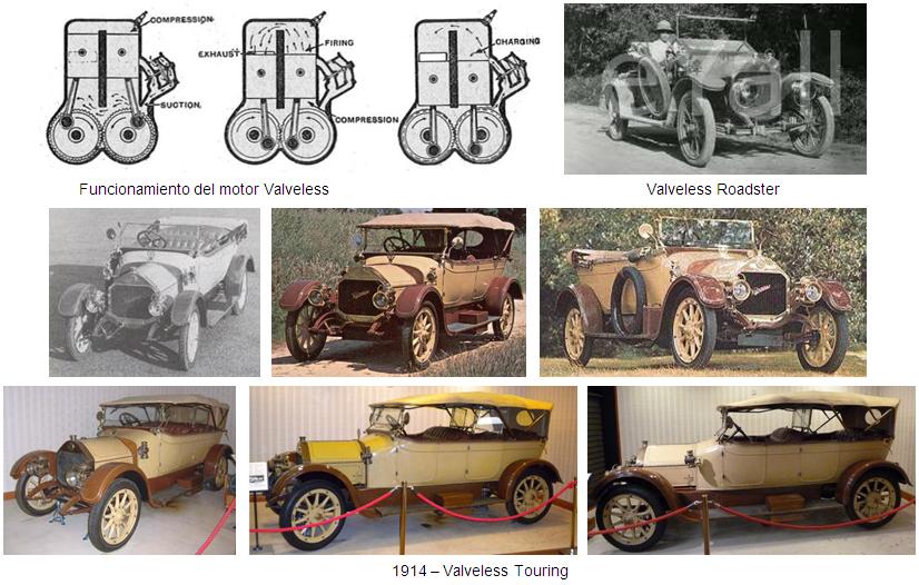 El primer coche Valveless fue anunciado a finales de 1907 y entró en producción en 1908. El nombre Valveless probablemente proviene del hecho de que los grandes y singulares motores de dos tiempos que utilizaban esos coches no disponían de válvulas. Se conocen al menos 4 modelos con capacidades de más de 3 litros. La configuración del motor Valveless se conoce como “split single”, ya que en realidad de trataba de un solo cilindro dividido en dos.