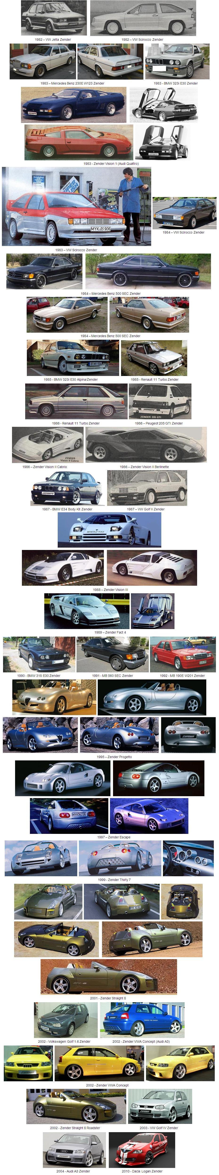 En 1983 fue presentado su primer desarrollo completo sobre la base de un Audi Quattro, denominado Zender Visión I. Otras realizaciones de Zender conocidas son; el Vision II (1986), el Vision III (1988), el Fact 4 (1989), el Progetto (1995), el Escape (1997), el Thirty (1999), el Straight Eight (2001), etc...